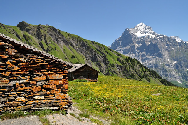 | The pretty alpine village of Murren. This is where we deviated from our usual travelling food rules (no asian food in european countries) and had chinese- it was delicious! Also, the white flowers may or may not be Adelweis. |